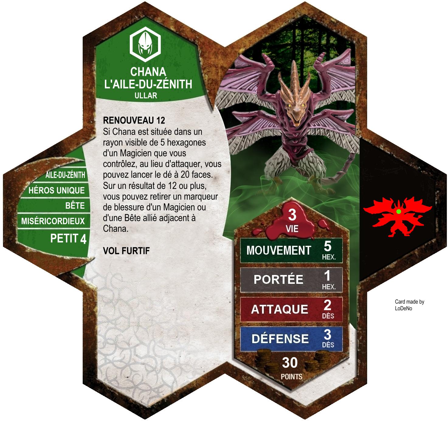 Étant un héros unique de taille Petit, Chana peut bénéficier d'un bonus au dé 20 grâce au pouvoir de Myrddin.